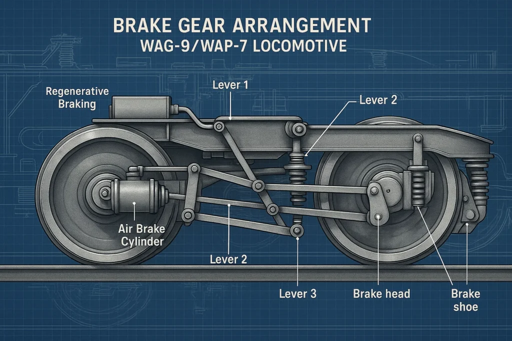 The Brake Gear Arrangement class locomotives is a robust system designed to deliver reliable braking performance for high-powered electric locomotives used in both freight (WAG-9) and passenger (WAP-7) services.